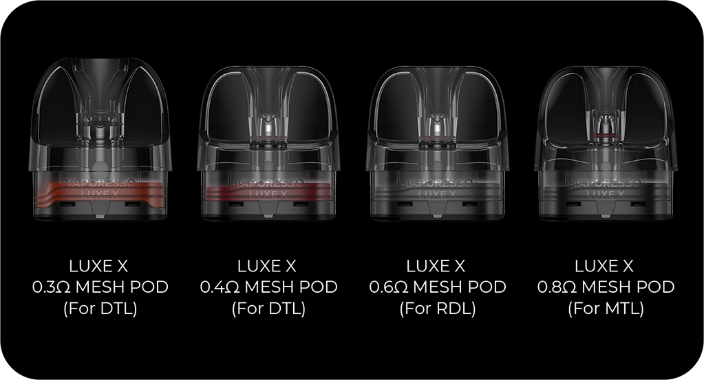 • LUXE X 0.4Ω MESH POD(32W) LXUE X 0.6Ω MESH POD(21W, Not Included) LUXE X 0.8Ω MESH POD(16W)